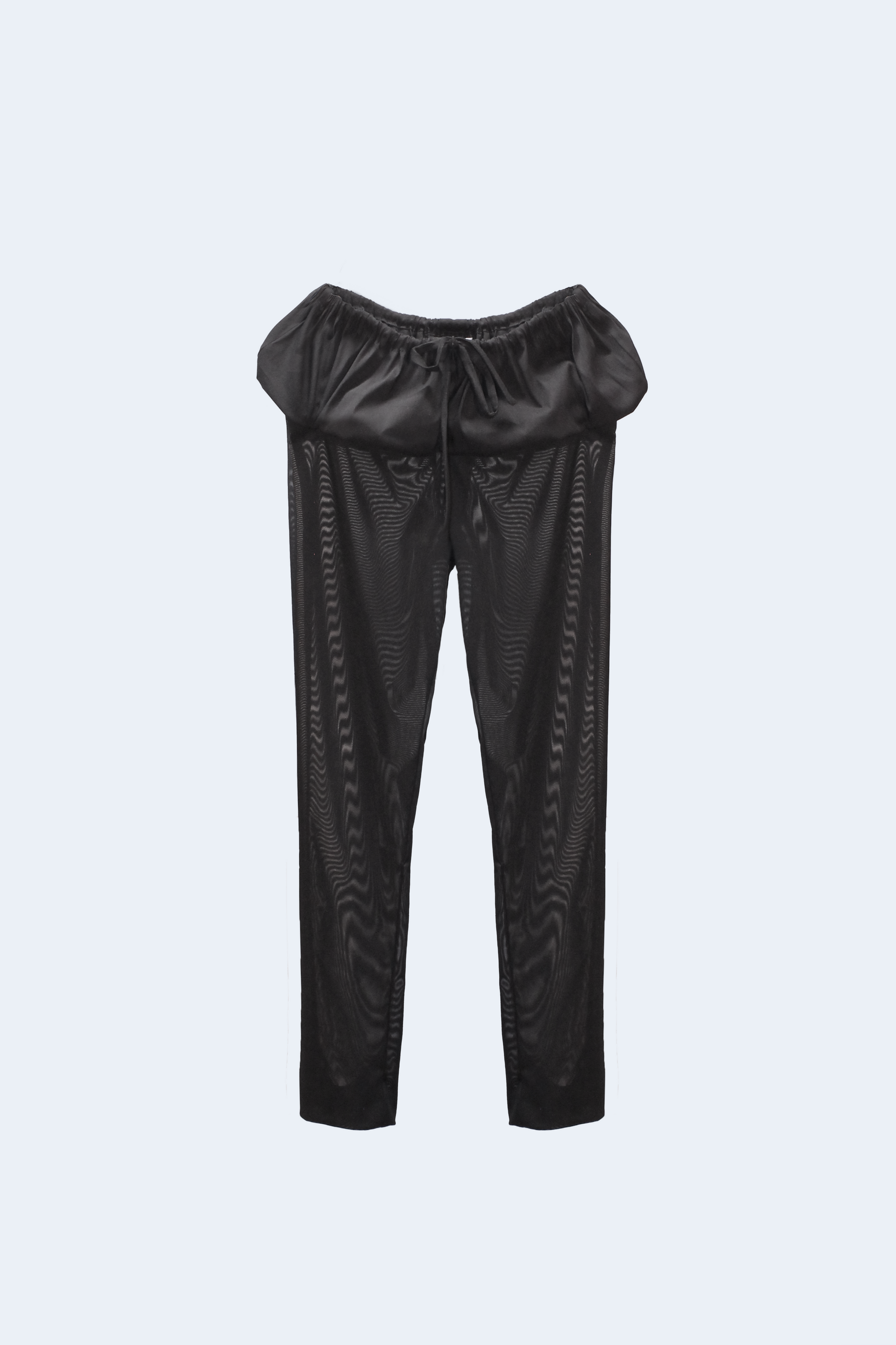 Semi-transparent fitted capri trousers in black with puffed detail between the hips and waist in stretch cotton poplin.