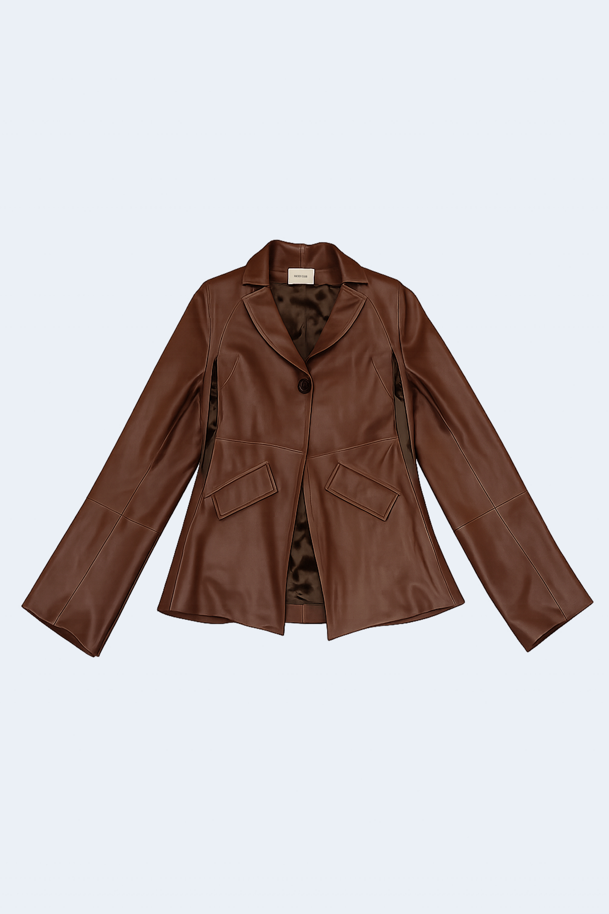 Hip-length brown jacket made from soft chocolate brown nappa leather with wide sleeves and front slits that allow for multiple arm positions. The garment fastens with a button at the front.