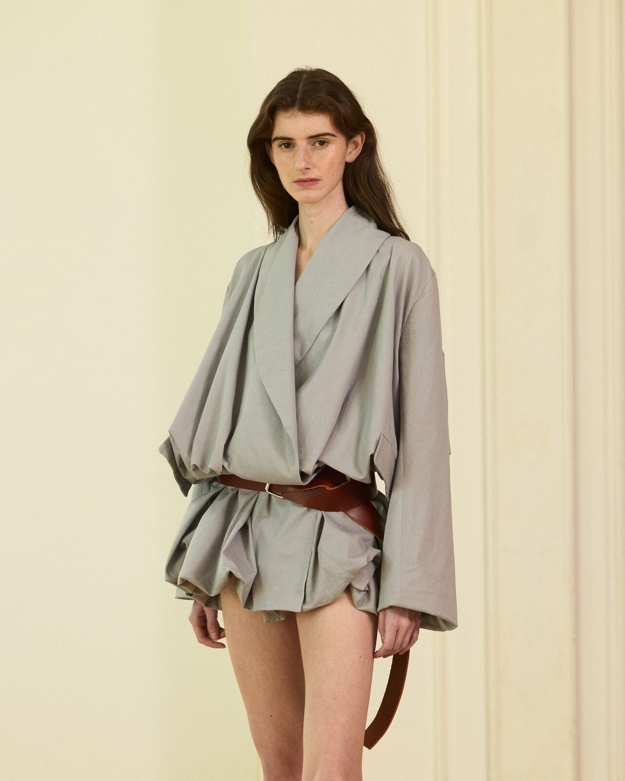 Grey volume gabardine with belt